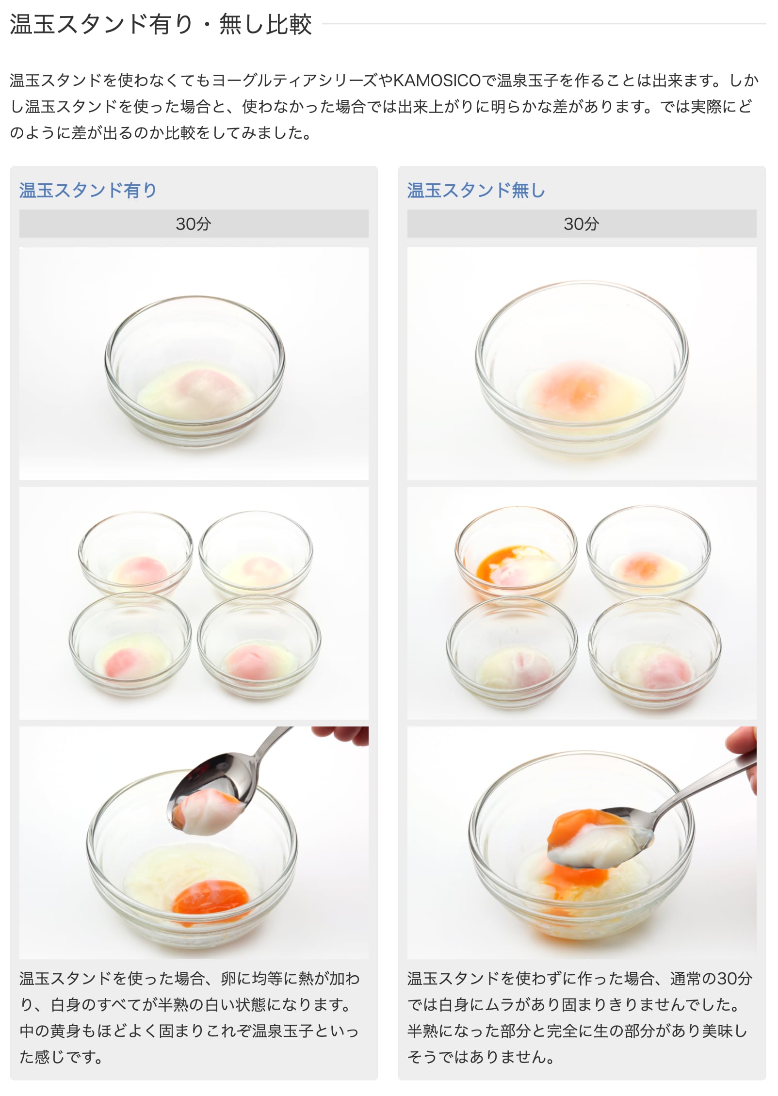 温玉スタンドを使わずに作った場合、通常の30分では白身にムラがあり固まりきりませんでした。半熟になった部分と完全に生の部分があり美味しそうではありません。